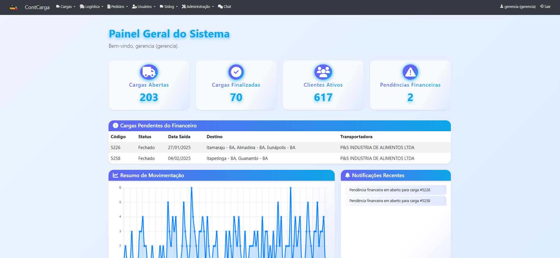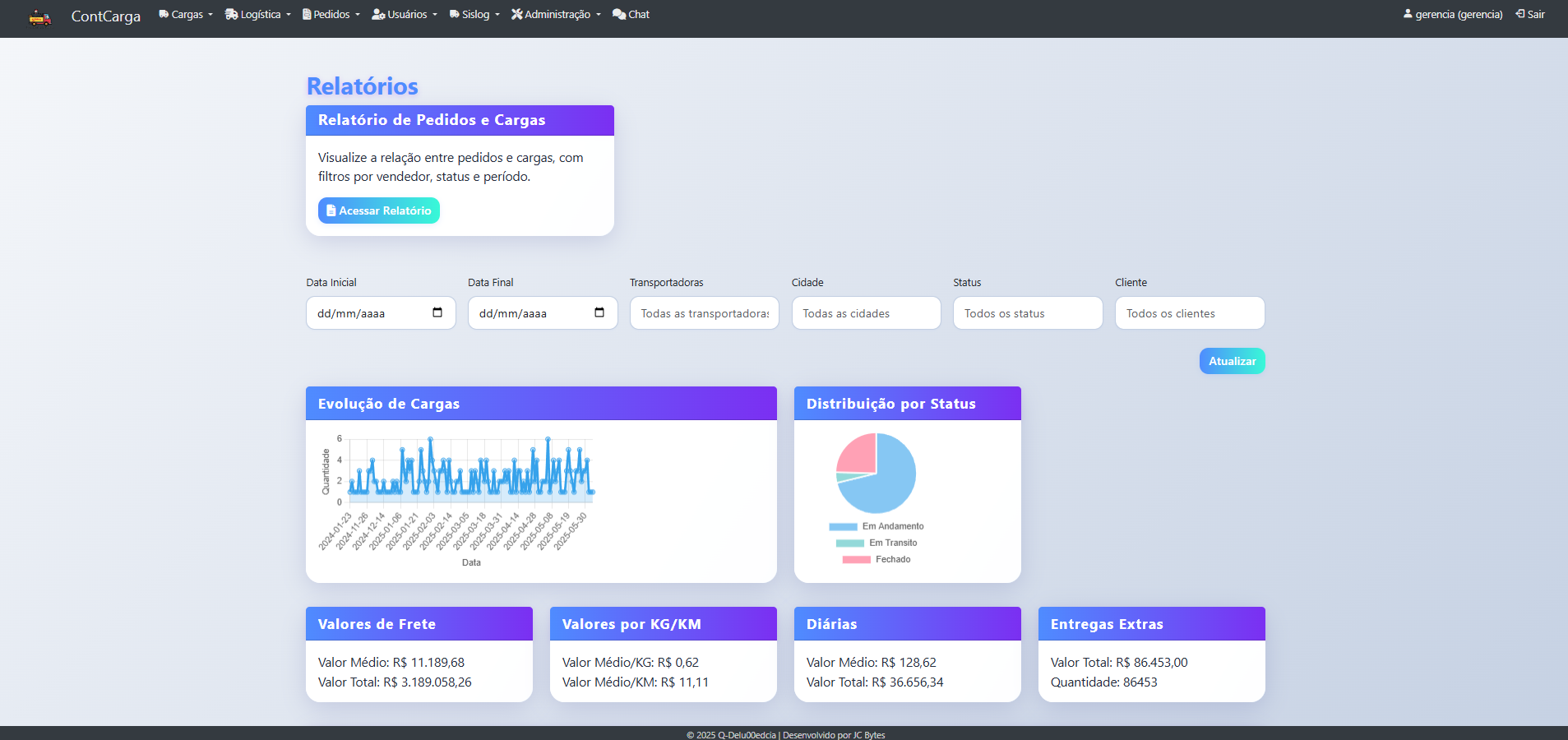 The Cargo Control System is a complete logistics management solution, developed to update and control cargo transportation operations. This system offers an intuitive interface and advanced features for efficient fleet, driver and cargo management.
